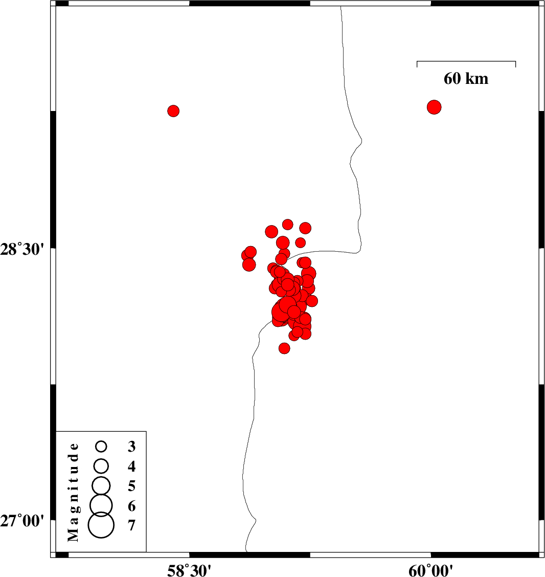 | 2010/12/30 | 02:43:03.0 | 06:13:03.0 | 28.46 | 58.86 | 18 | ML3.4 | Kerman Province, 87 km South-East of Bam |
