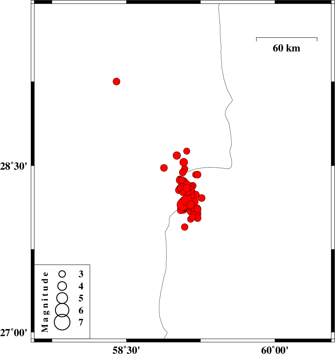 2011/01/27 09:47:30.6 13:17:30.6 28.6359.1115 ML3 Kerman Province, 91 km South-East of Bam