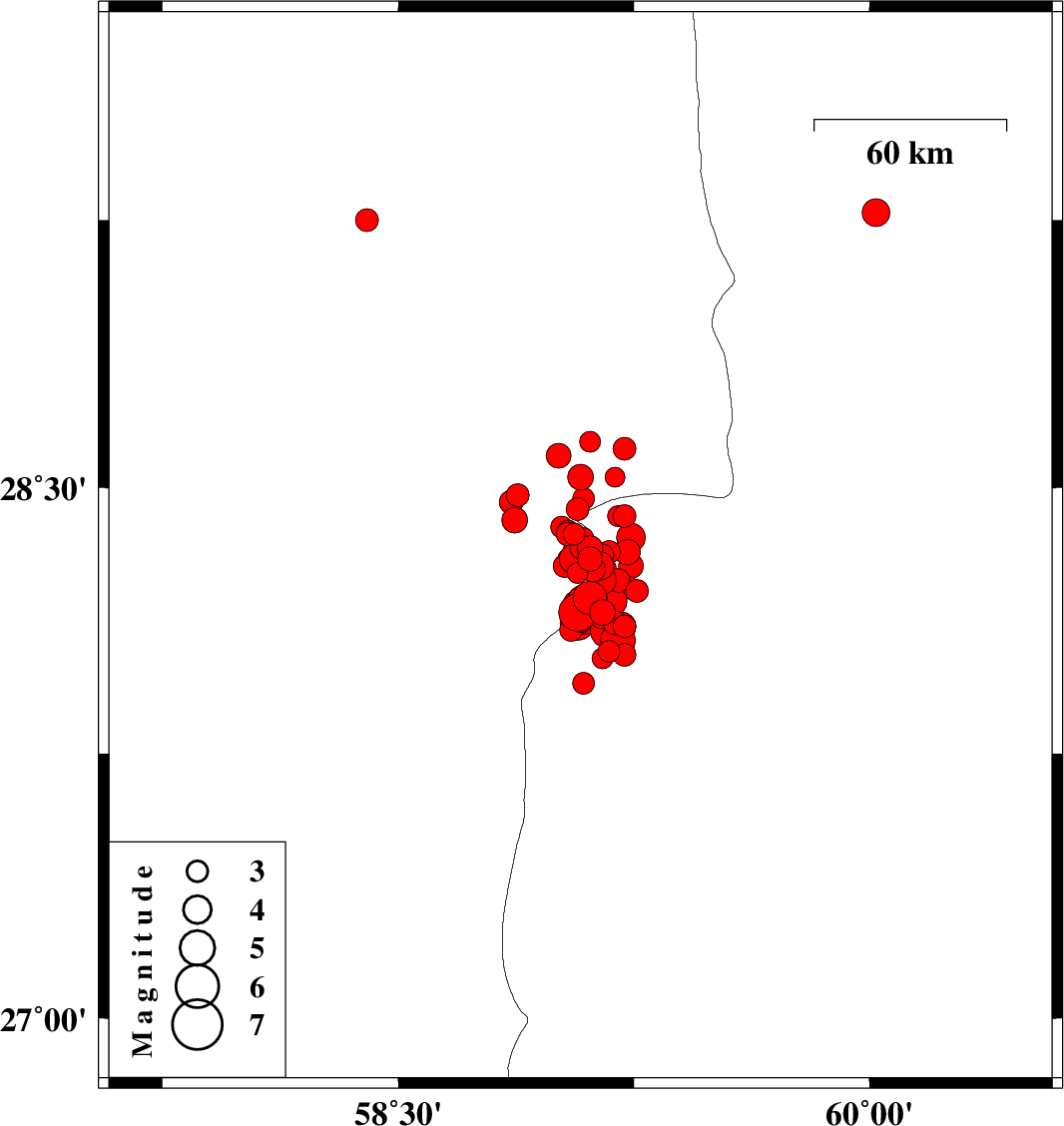 2011/01/27 08:38:28.5 12:08:28.5 28.1559.0915 Mb6.2 Kerman Province, 139 km North-East of Kahnuj
