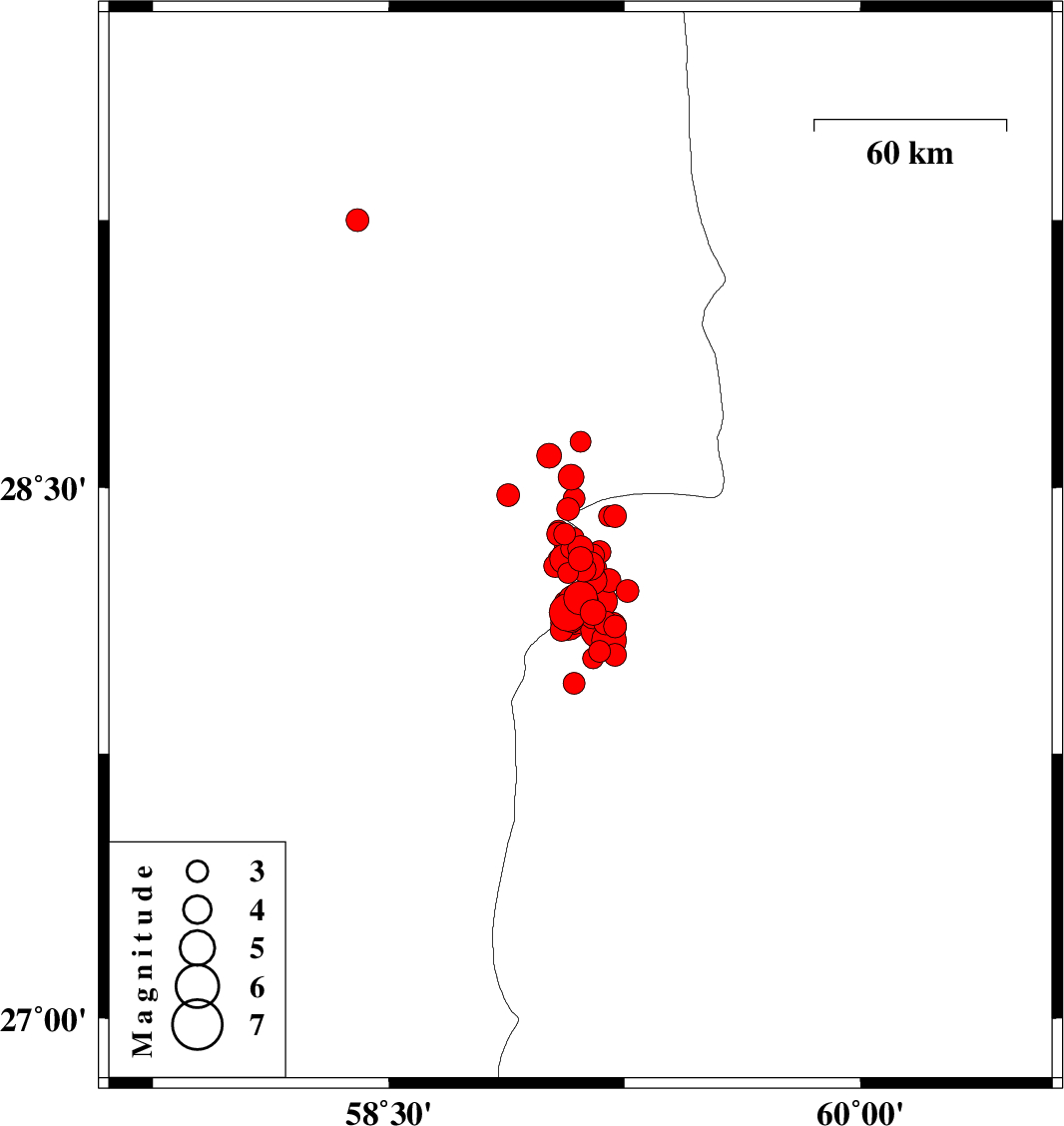 2011/01/27 08:38:28.5 12:08:28.5 28.1559.0915 Mb6.2 Kerman Province, 139 km North-East of Kahnuj