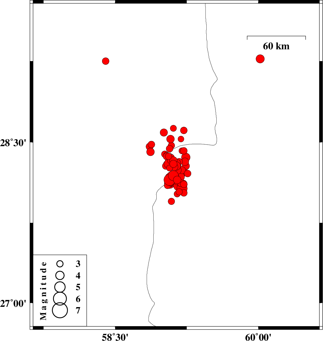 2011/01/27 09:47:30.6 13:17:30.6 28.6359.1115 ML3 Kerman Province, 91 km South-East of Bam