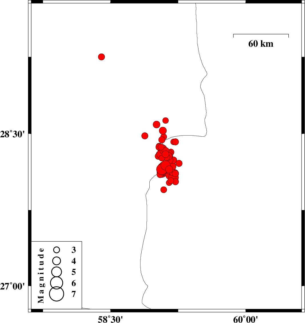 | 2011/01/28 | 00:45:04.8 | 04:15:04.8 | 28.13 | 59.08 | 15 | ML3.7 | Kerman Province, 138 km North-East of Kahnuj | ||