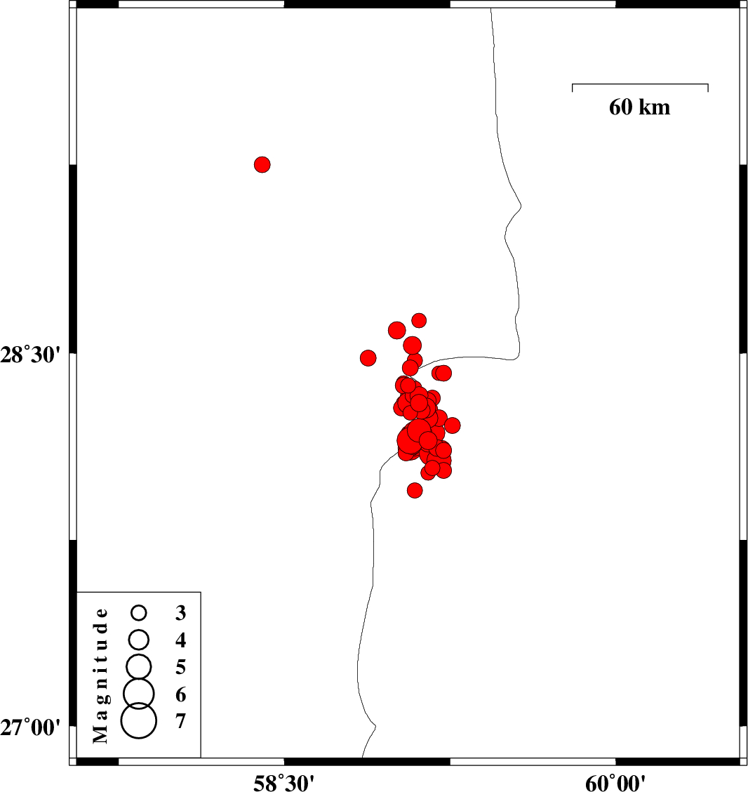 2011/01/27 08:38:28.5 12:08:28.5 28.1559.0915 Mb6.2 Kerman Province, 139 km North-East of Kahnuj