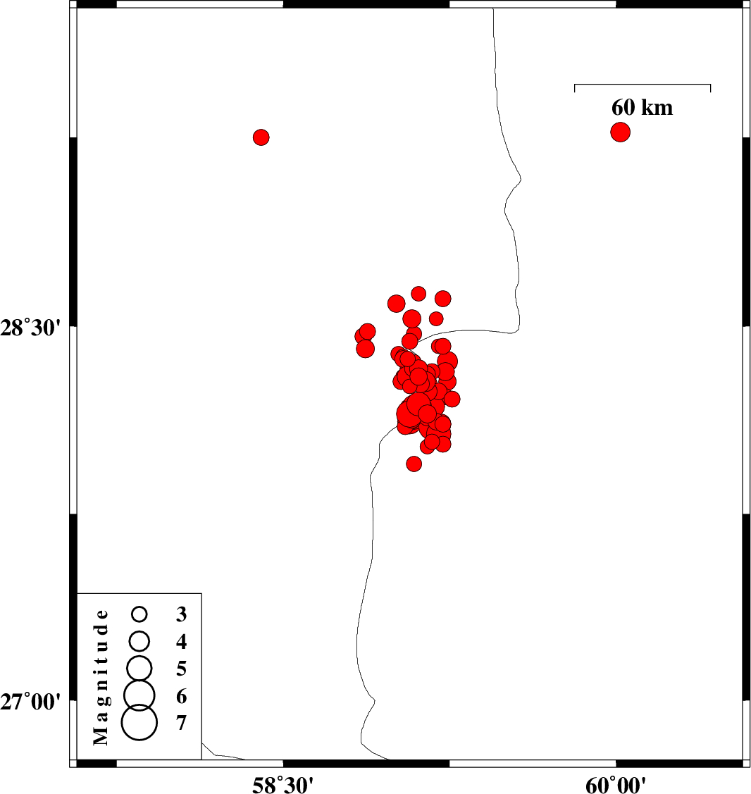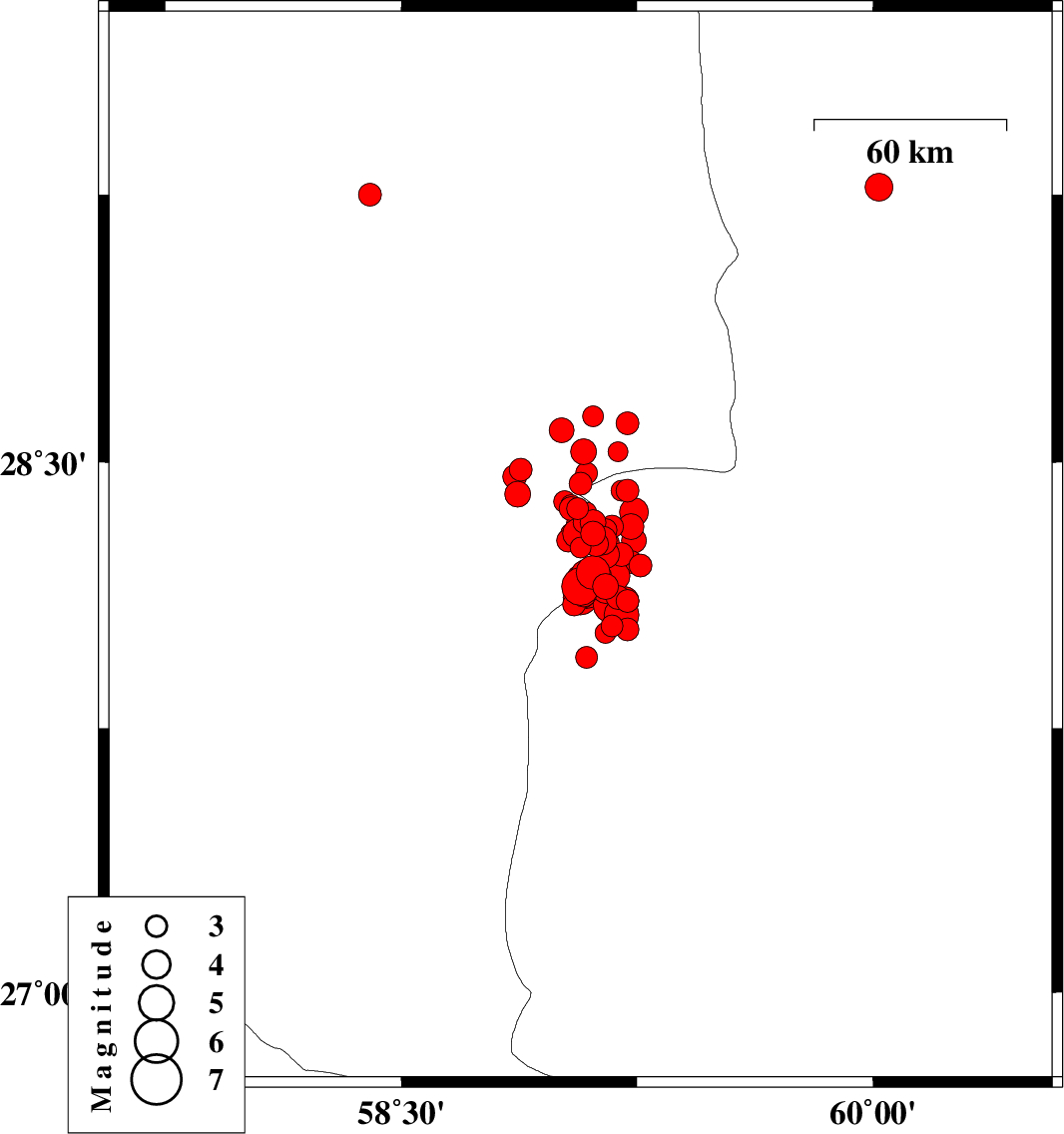 2011/01/27 08:38:28.5 12:08:28.5 28.1559.0915 Mb6.2 Kerman Province, 139 km North-East of Kahnuj