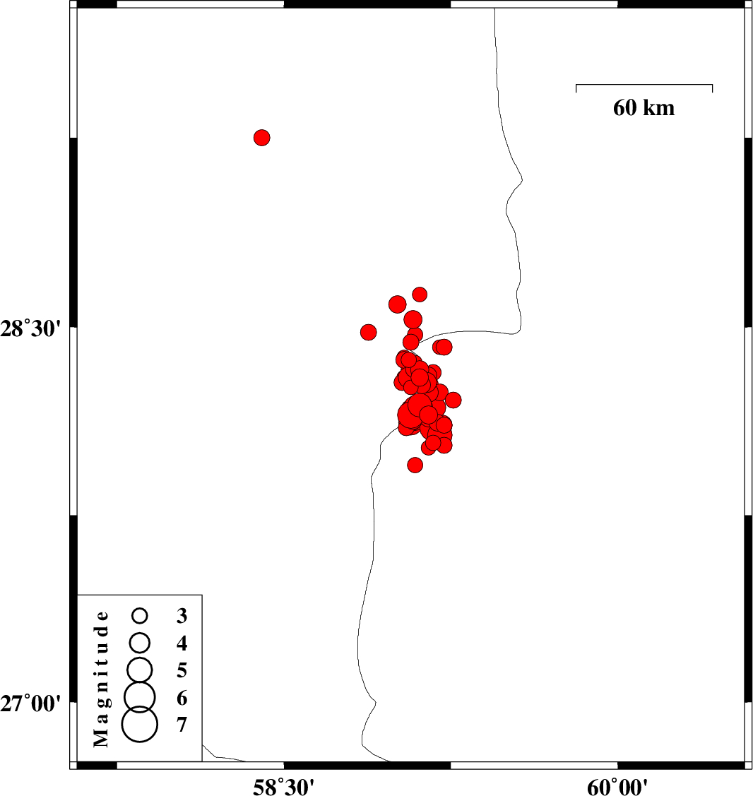 | 2011/01/28 | 00:45:04.8 | 04:15:04.8 | 28.13 | 59.08 | 15 | ML3.7 | Kerman Province, 138 km North-East of Kahnuj | ||