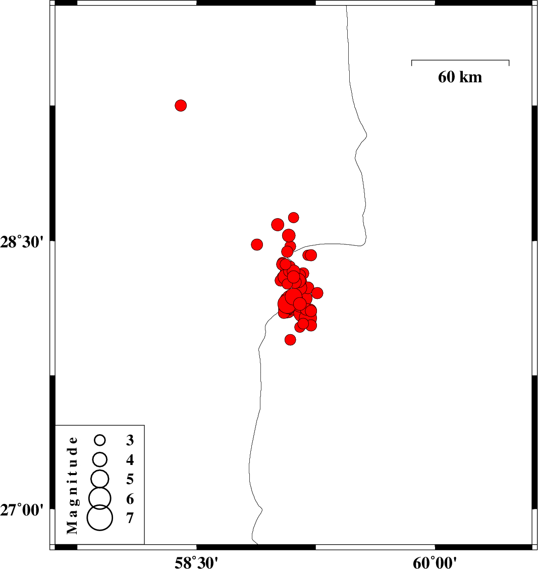 | 2011/01/28 | 00:45:04.8 | 04:15:04.8 | 28.13 | 59.08 | 15 | ML3.7 | Kerman Province, 138 km North-East of Kahnuj | ||