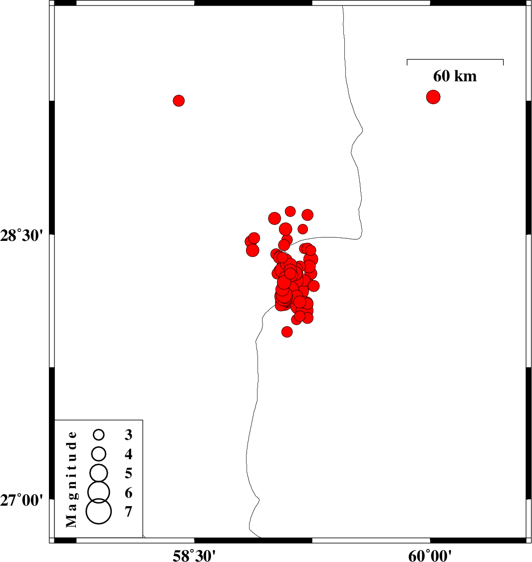 2011/01/27 08:38:28.5 12:08:28.5 28.1559.0915 Mb6.2 Kerman Province, 139 km North-East of Kahnuj