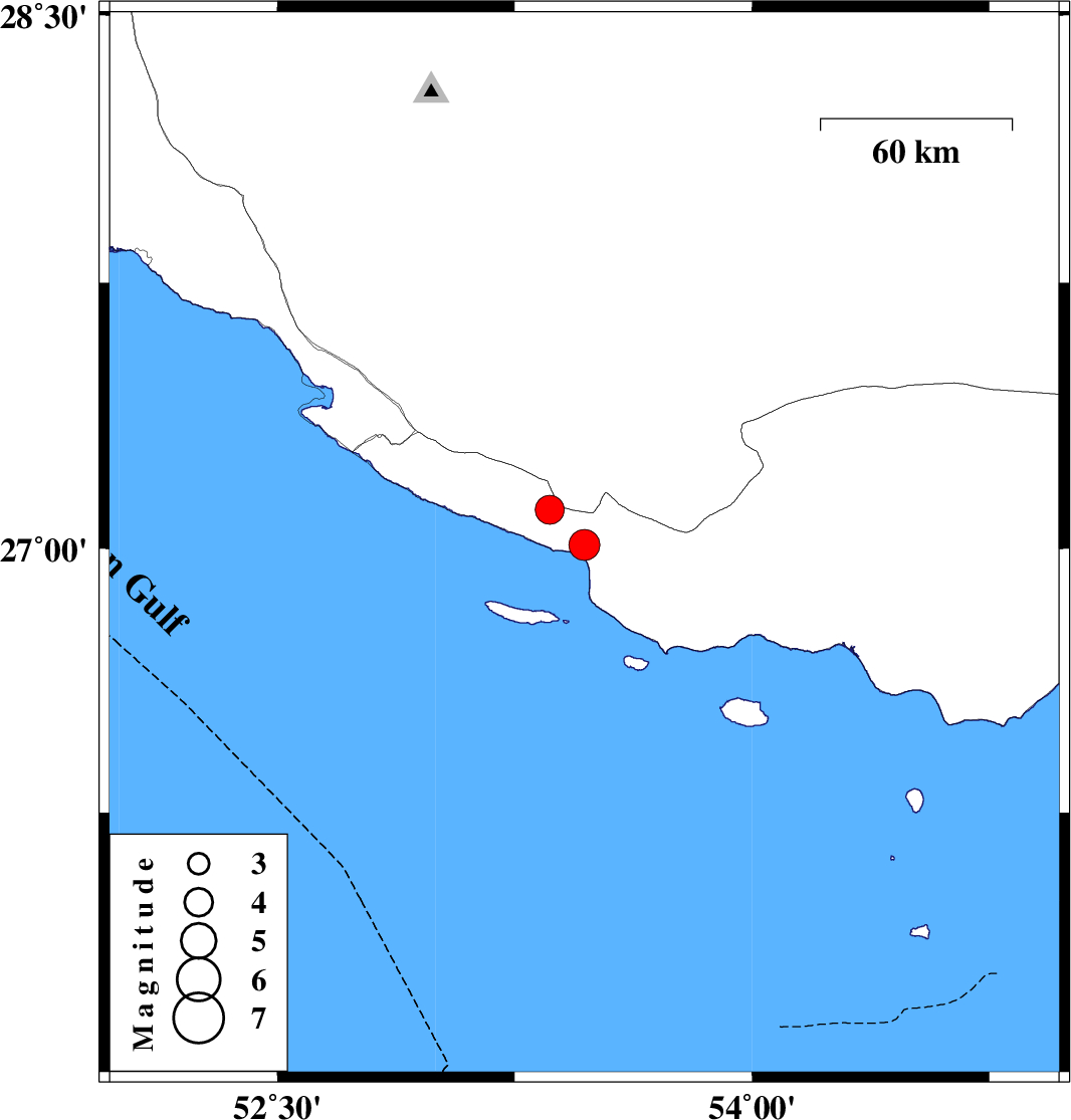 | 2011/01/30 | 18:54:22.9 | 22:24:22.9 | 27.11 | 53.36 | 43 | ML4.1 | Hormozgan Province, 32 km South-East of Lamerd |