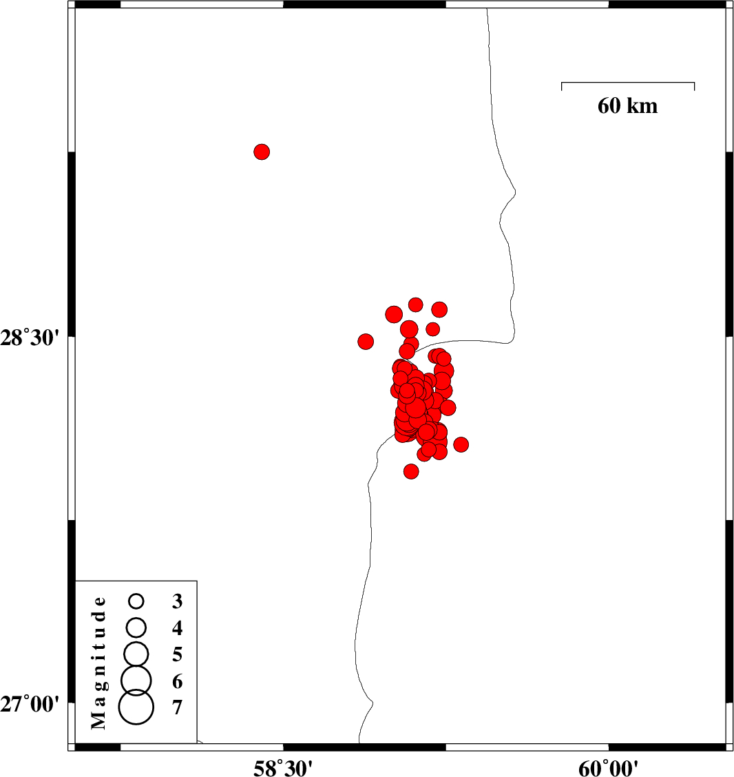 | 2011/01/29 | 14:56:19.2 | 18:26:19.2 | 28.23 | 59.07 | 14 | ML4 | Kerman Province, 120 km South-East of Bam | ||