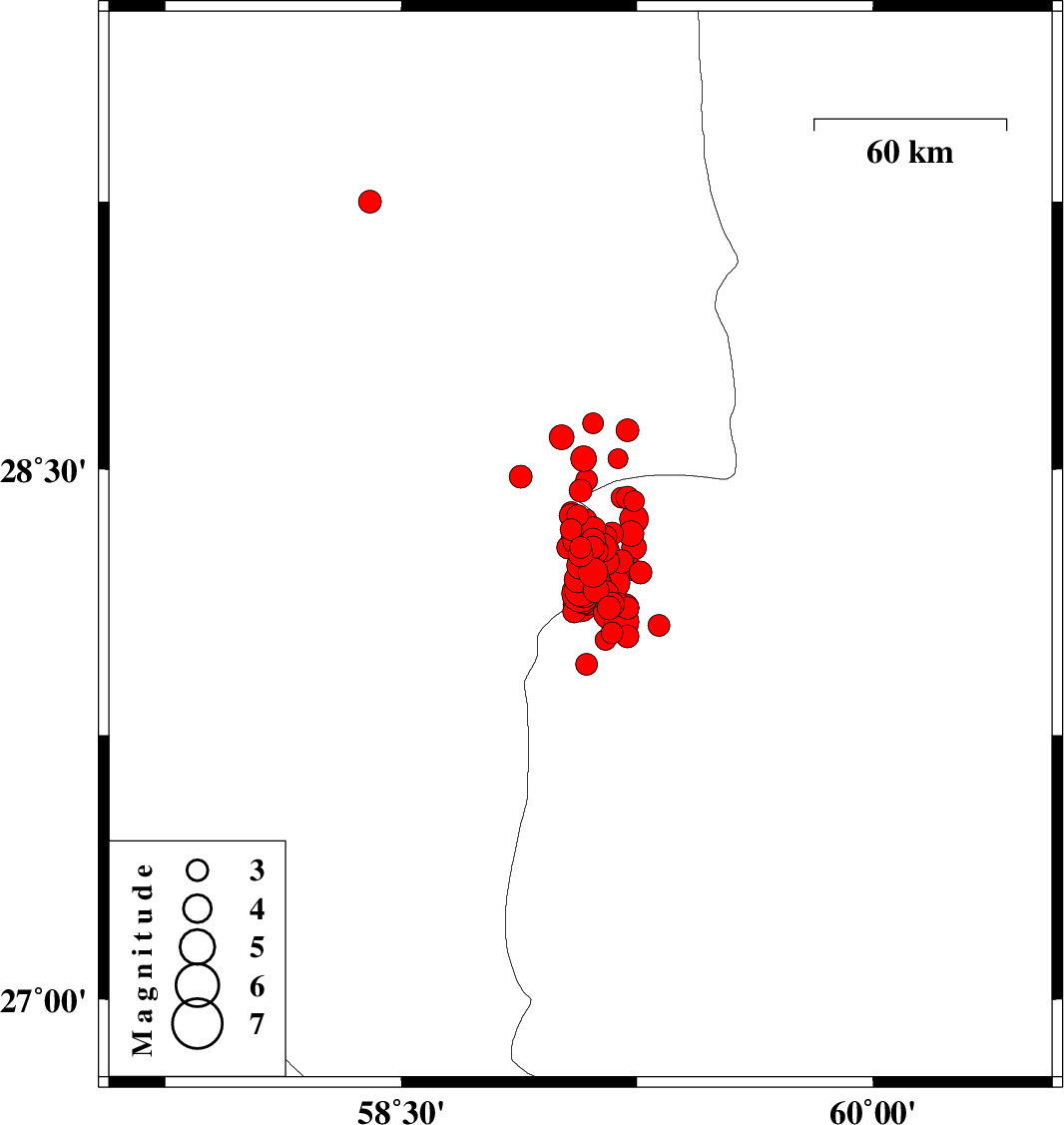 | 2011/01/29 | 14:56:19.2 | 18:26:19.2 | 28.23 | 59.07 | 14 | ML4 | Kerman Province, 120 km South-East of Bam | ||