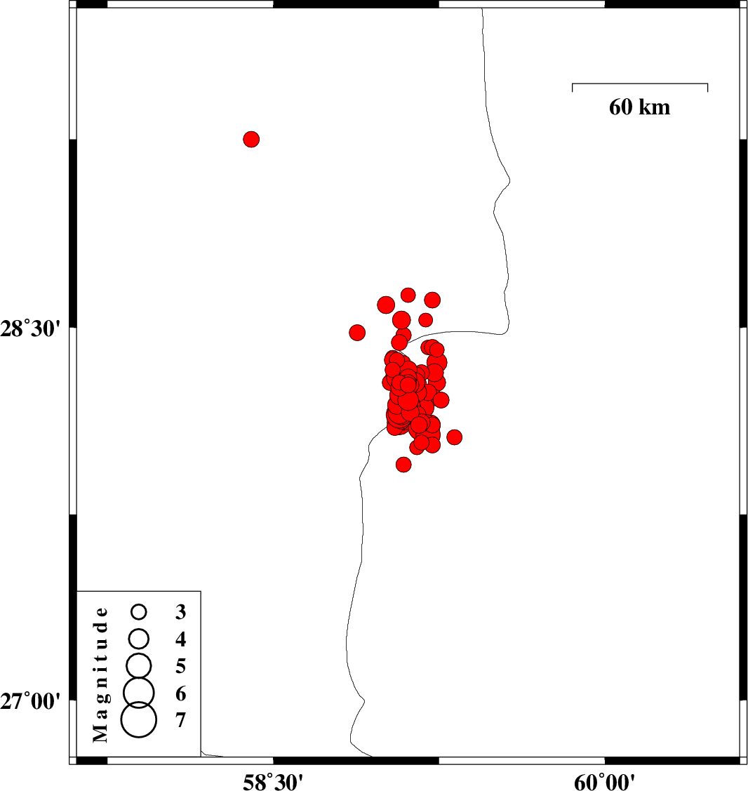 | 2011/01/28 | 00:45:04.8 | 04:15:04.8 | 28.13 | 59.08 | 15 | ML3.7 | Kerman Province, 138 km North-East of Kahnuj | ||