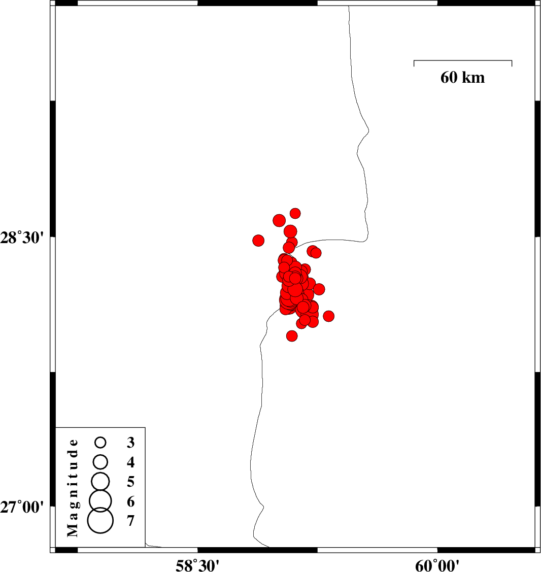| 2011/01/29 | 14:56:19.2 | 18:26:19.2 | 28.23 | 59.07 | 14 | ML4 | Kerman Province, 120 km South-East of Bam | ||