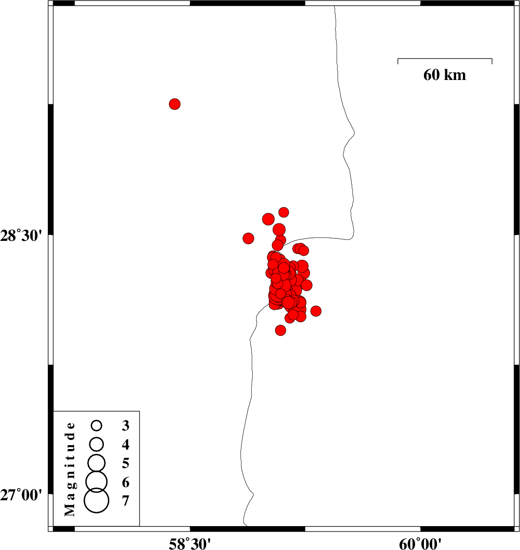 | 2011/01/28 | 20:17:16.1 | 23:47:16.1 | 28.3 | 59.11 | 15 | ML3.5 | Kerman Province, 116 km South-East of Bam | ||