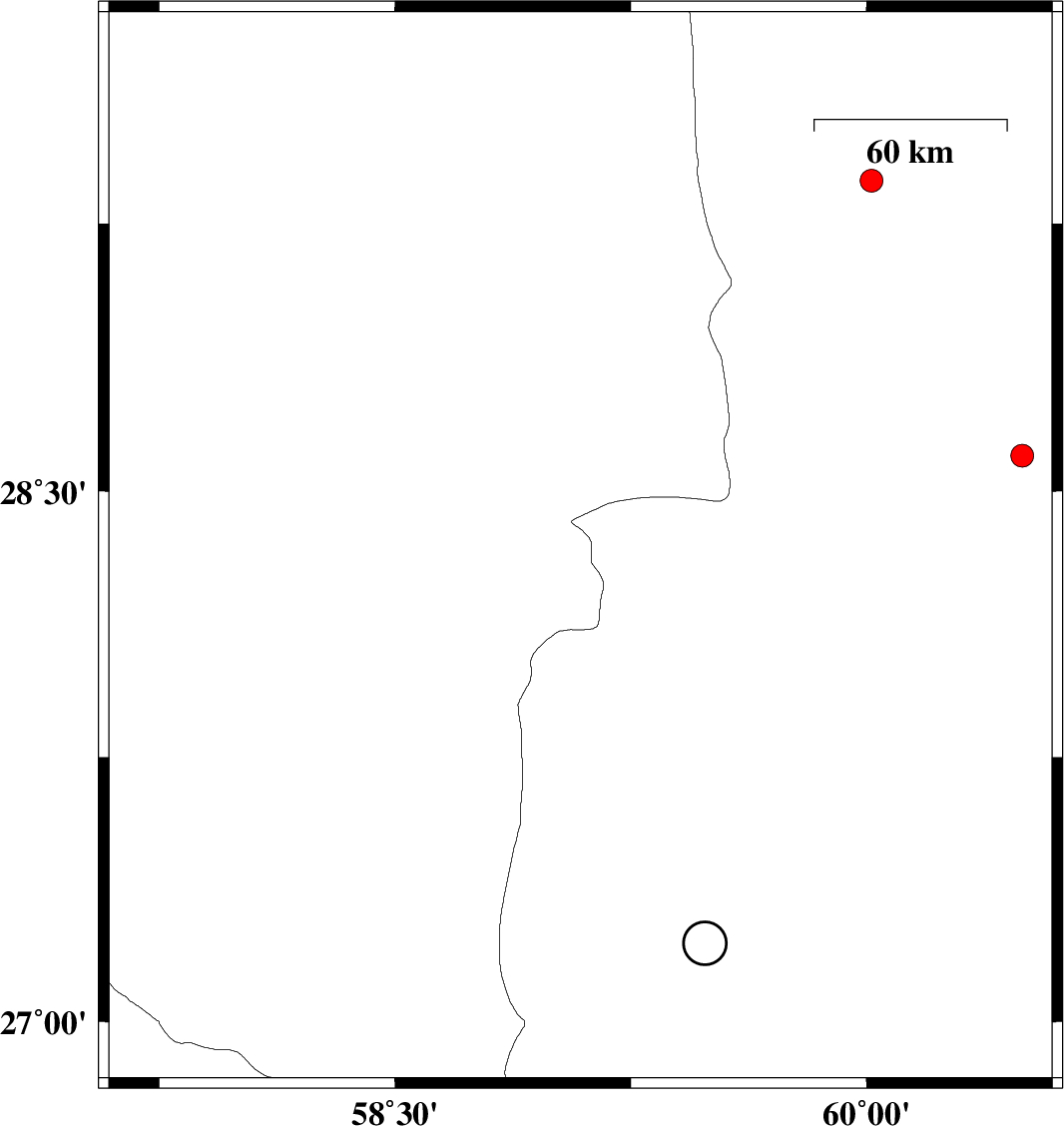 | 2011/01/28 | 20:17:16.1 | 23:47:16.1 | 28.3 | 59.11 | 15 | ML3.5 | Kerman Province, 116 km South-East of Bam | ||