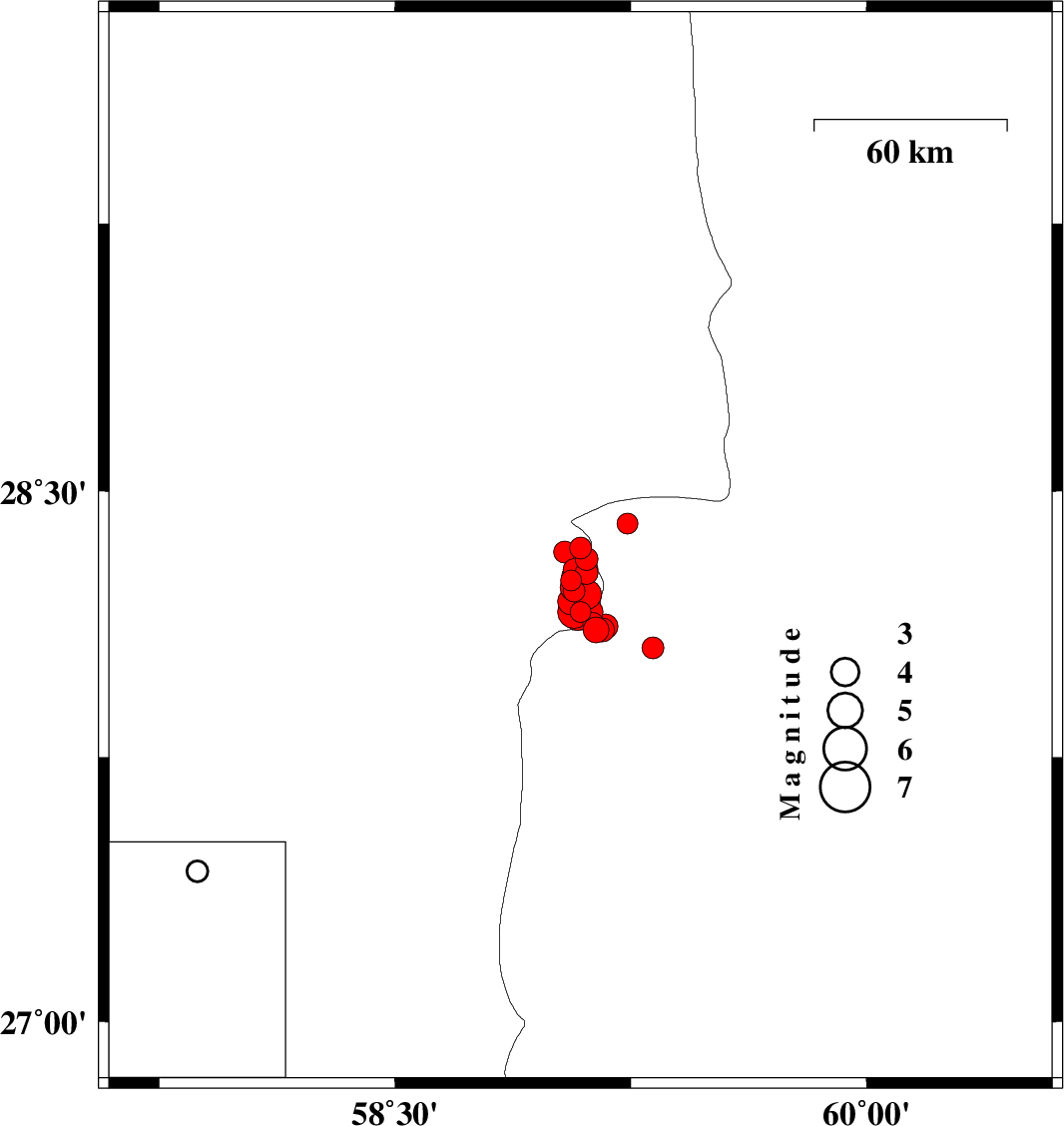 | 2011/01/29 | 00:50:18.2 | 04:20:18.2 | 28.15 | 59.08 | 15 | ML4.1 | Kerman Province, 138 km North-East of Kahnuj |