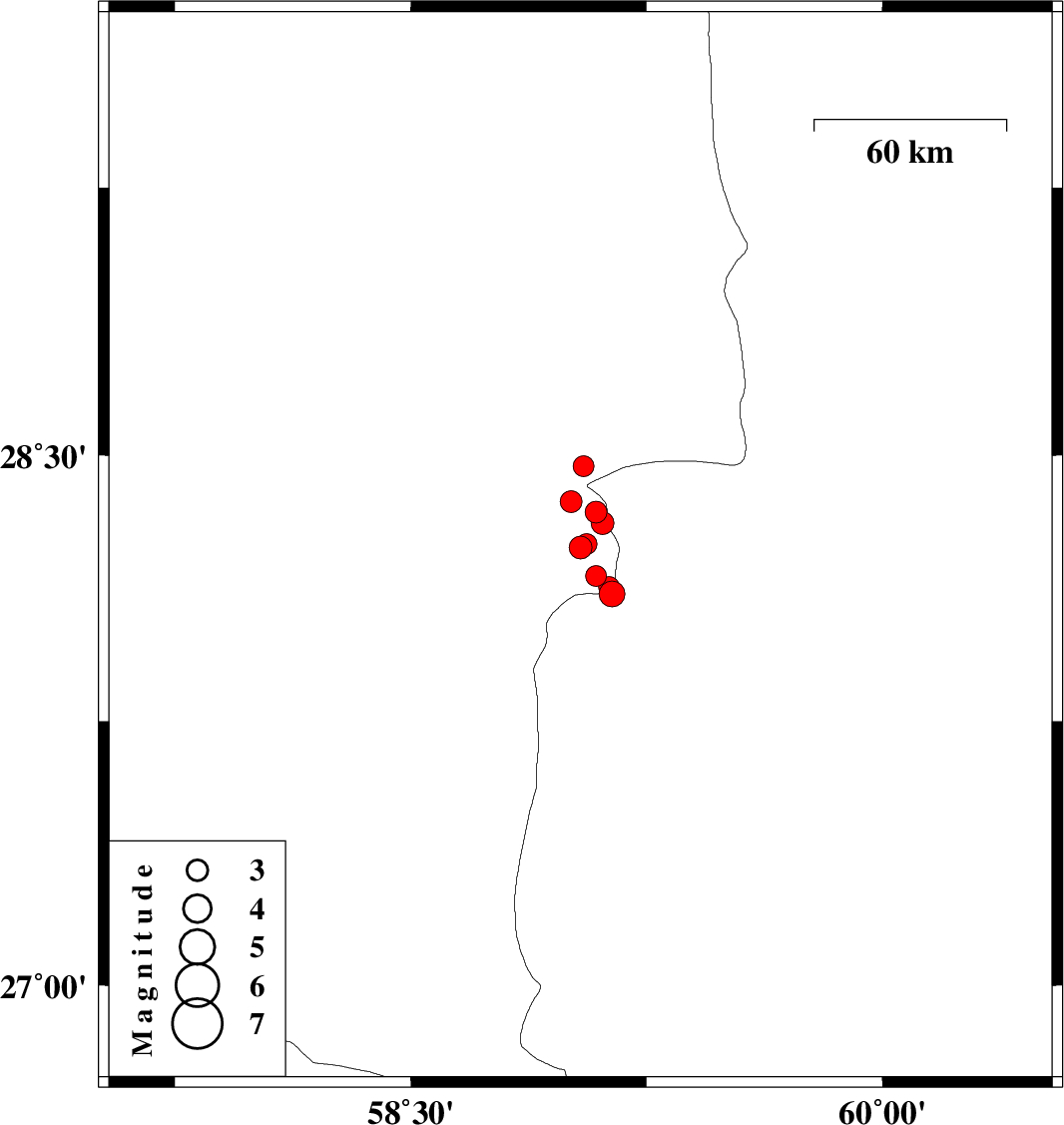 | 2011/02/04 | 22:03:23.9 | 01:33:23.9 | 28.25 | 59.06 | 14 | ML3 | Kerman Province, 118 km South-East of Bam | ||
