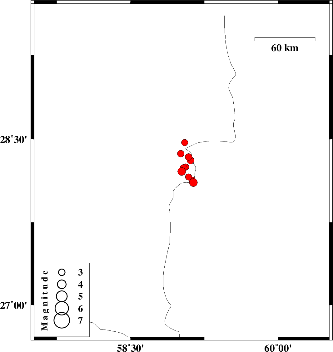 | 2011/02/06 | 06:01:07.6 | 09:31:07.6 | 28.47 | 59.05 | 15 | ML3 | Kerman Province, 98 km South-East of Bam | ||