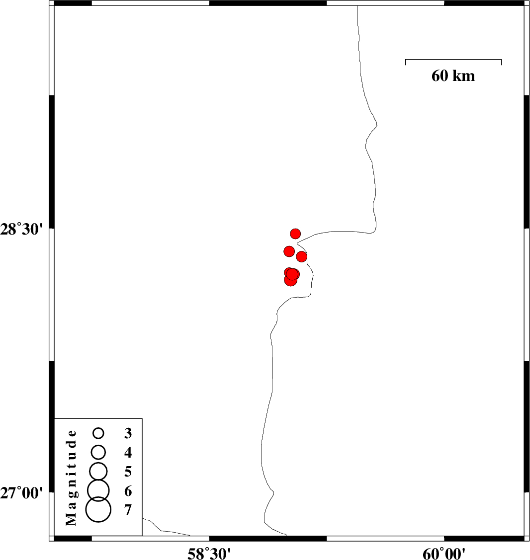 | 2011/02/05 | 21:55:19.3 | 01:25:19.3 | 28.34 | 59.09 | 14 | ML3.1 | Kerman Province, 112 km South-East of Bam |