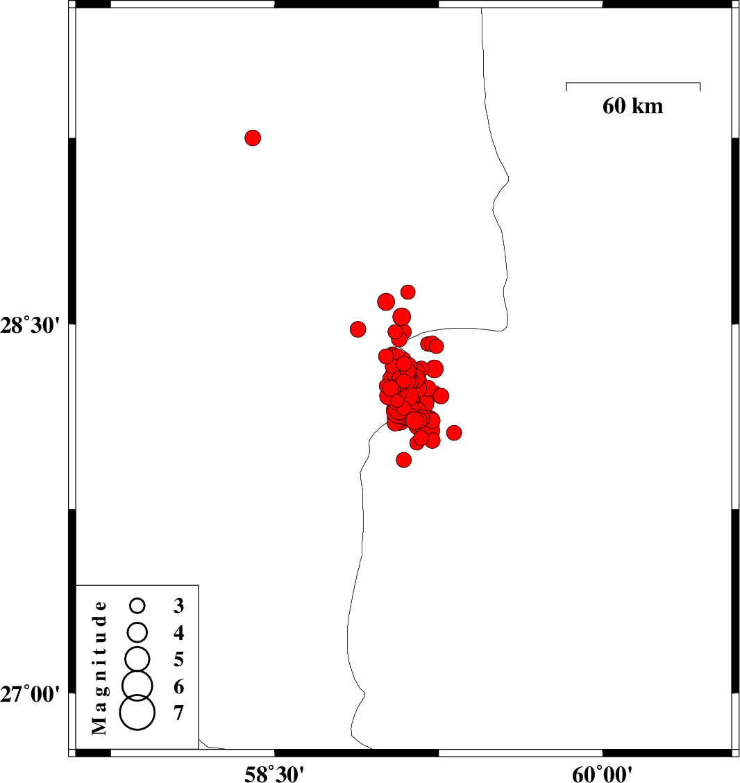 | 2011/01/27 | 08:38:28.5 | 12:08:28.5 | 28.15 | 59.09 | 15 | Mb6.2 | Kerman Province, 139 km North-East of Kahnuj | ||