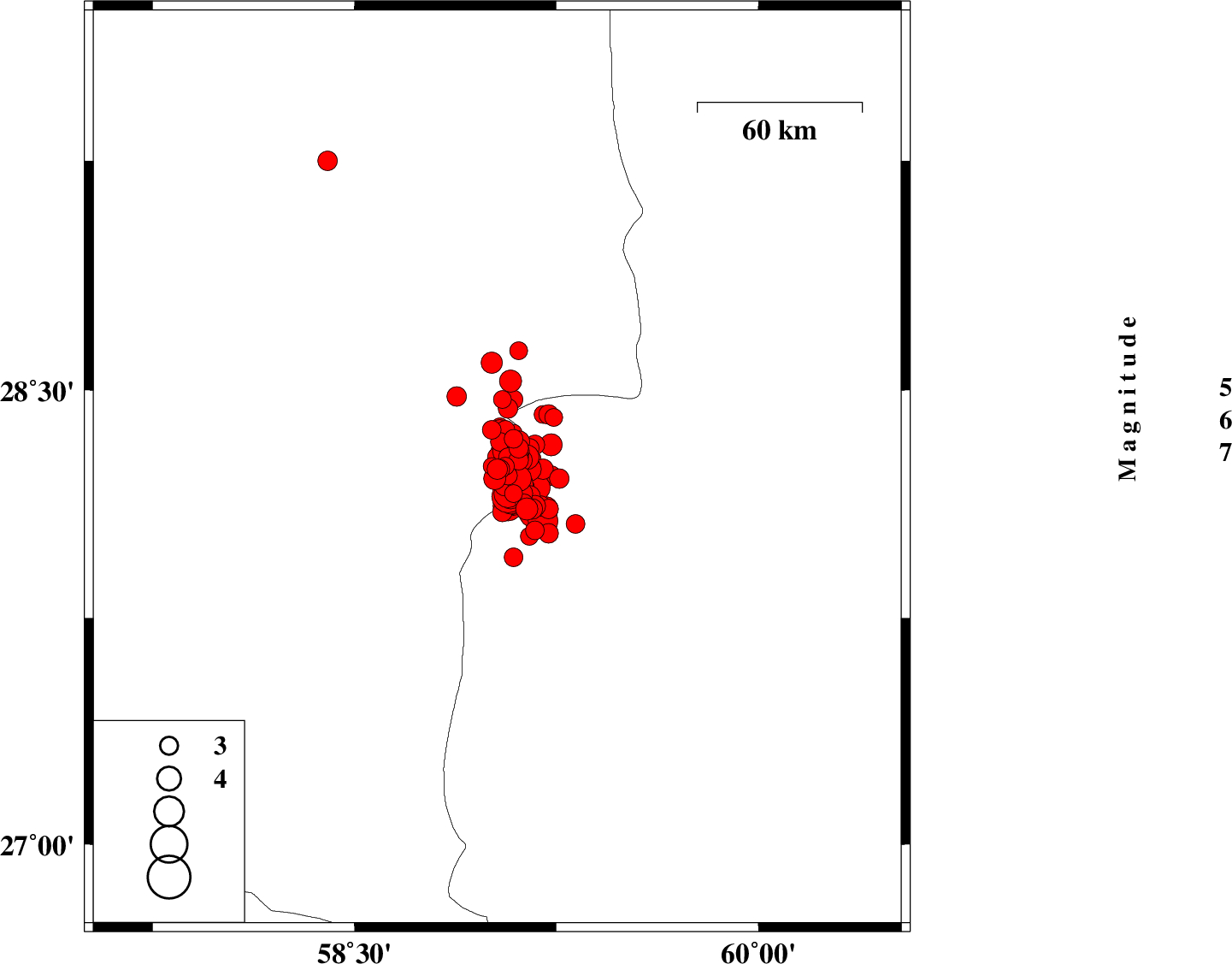 | 2011/01/27 | 08:38:28.5 | 12:08:28.5 | 28.15 | 59.09 | 15 | Mb6.2 | Kerman Province, 139 km North-East of Kahnuj | ||