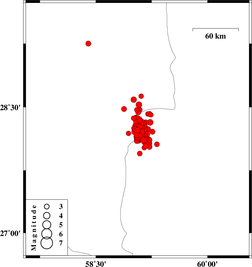 | 2011/01/27 | 08:38:28.5 | 12:08:28.5 | 28.15 | 59.09 | 15 | Mb6.2 | Kerman Province, 139 km North-East of Kahnuj | ||