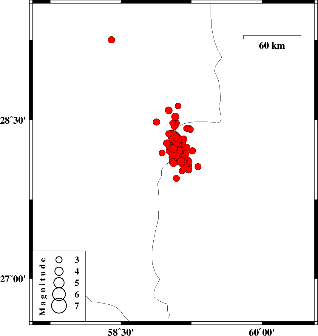 | 2011/01/28 | 20:17:16.1 | 23:47:16.1 | 28.3 | 59.11 | 15 | ML3.5 | Kerman Province, 116 km South-East of Bam | ||