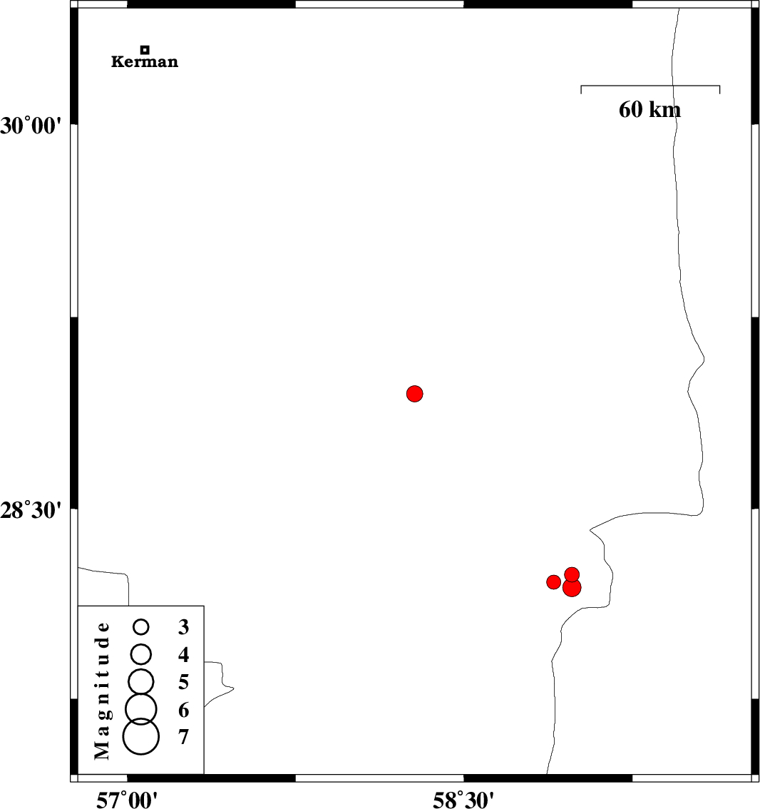| 2011/02/28 | 21:30:07.3 | 01:00:07.3 | 28.24 | 58.98 | 14 | ML3 | Kerman Province, 114 km South-East of Bam | ||