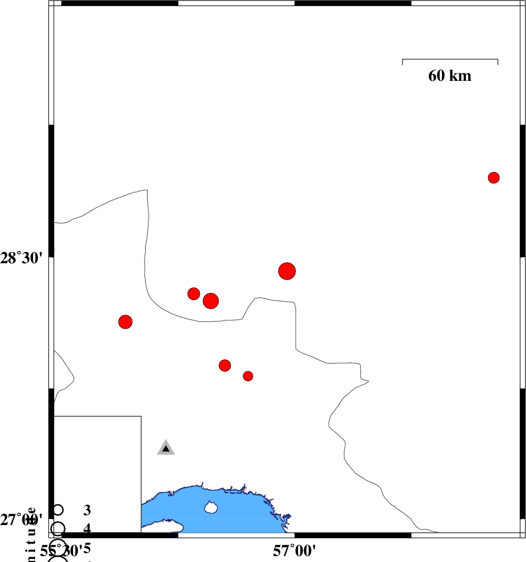 | 2011/02/05 | 16:20:10.1 | 19:50:10.1 | 28.29 | 56.35 | 14 | ML3.5 | Kerman Province, 44 km East of Hajiabad |