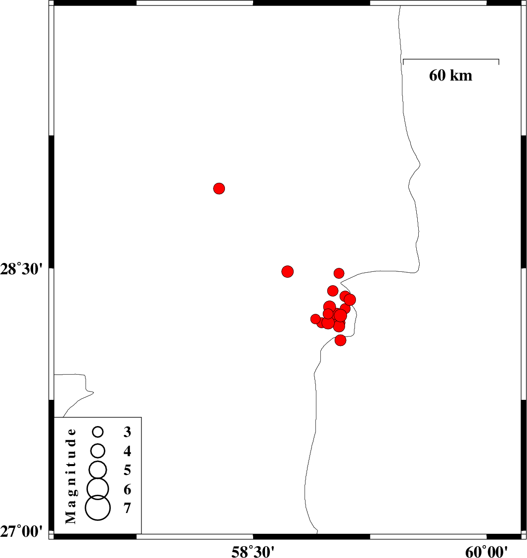 | 2011/02/05 | 21:55:19.3 | 01:25:19.3 | 28.34 | 59.09 | 14 | ML3.1 | Kerman Province, 112 km South-East of Bam |