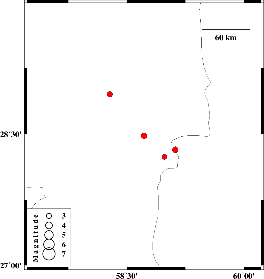 | 2011/02/28 | 21:30:07.3 | 01:00:07.3 | 28.24 | 58.98 | 14 | ML3 | Kerman Province, 114 km South-East of Bam |