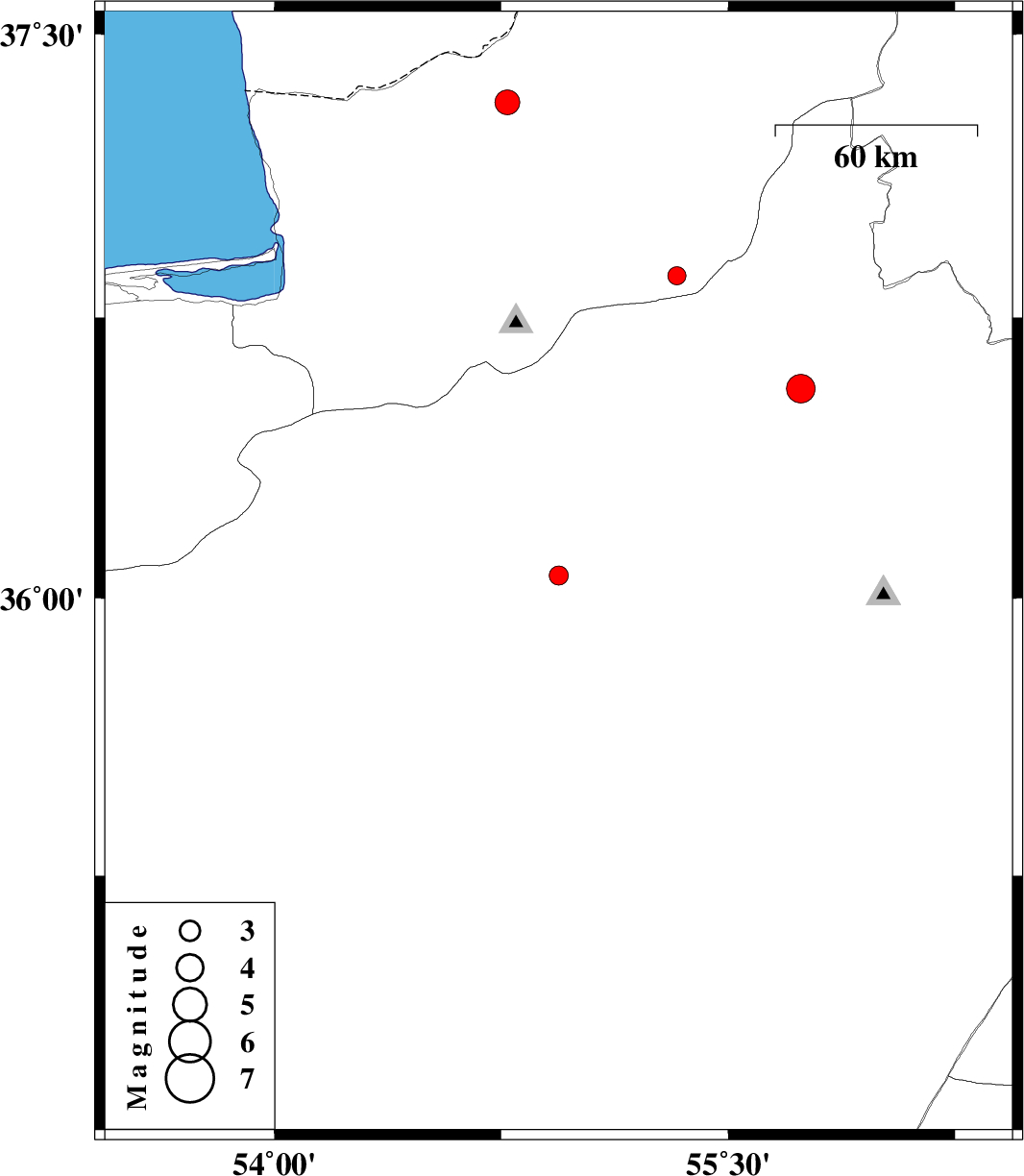 | 2011/02/07 | 21:35:39.3 | 01:05:39.3 | 37.32 | 54.77 | 41 | ML3.6 | Golestan Province, 34 km West of Gonbad-e kavus |