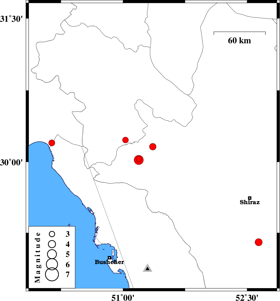 | 2011/02/13 | 11:56:13.8 | 15:26:13.8 | 29.15 | 52.64 | 10 | ML4 | Fars Province, 36 km North of Firuz Abad |