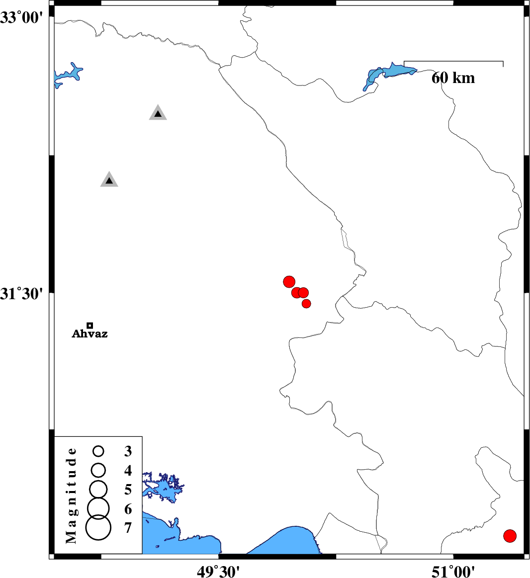 | 2011/03/18 | 05:39:31.9 | 09:09:31.9 | 31.5 | 50.04 | 17 | ML2.9 | Khoozestan Province, 13 km East of Bagh Malek | ||