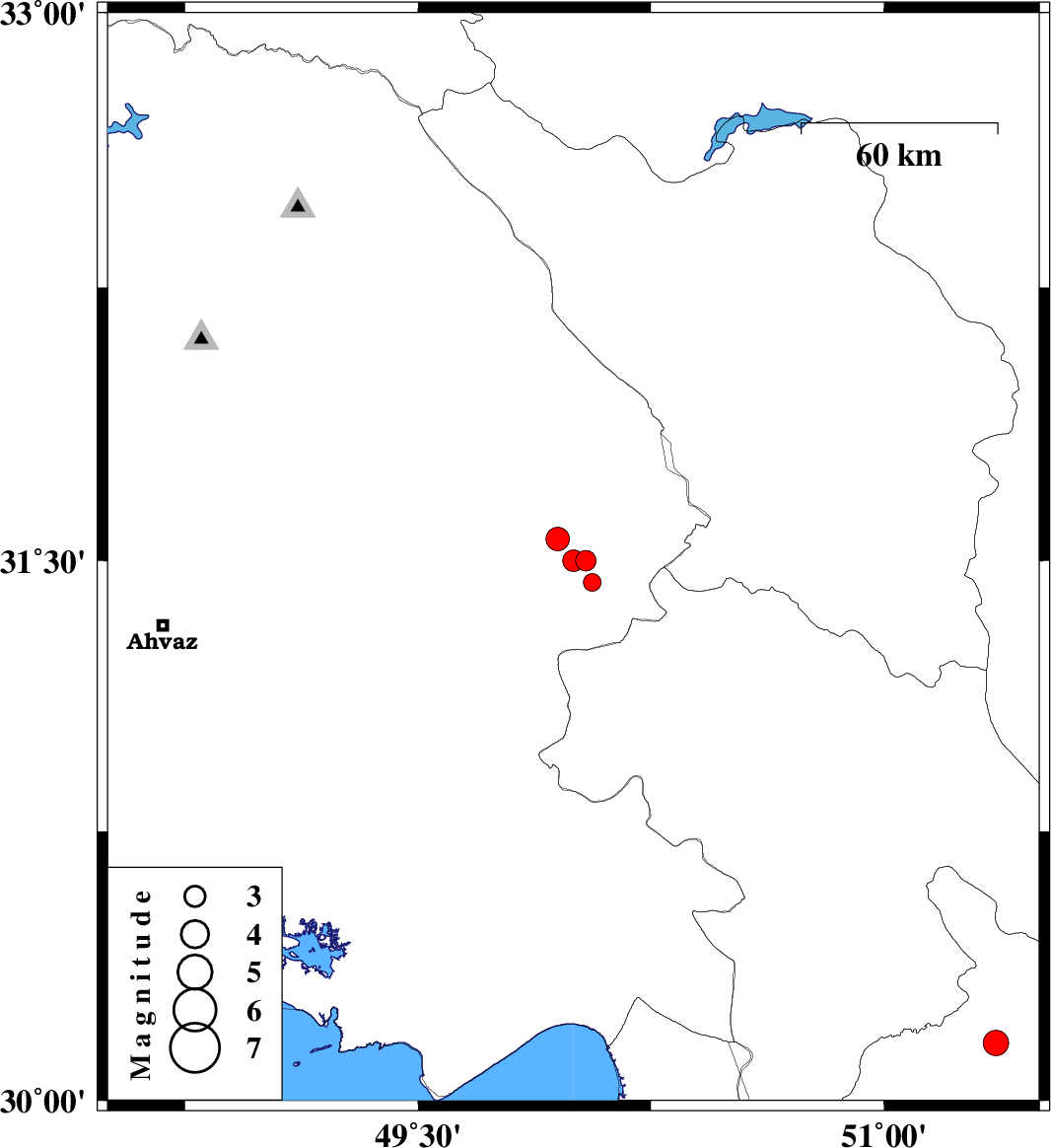 | 2011/03/18 | 05:39:31.9 | 09:09:31.9 | 31.5 | 50.04 | 17 | ML2.9 | Khoozestan Province, 13 km East of Bagh Malek | ||