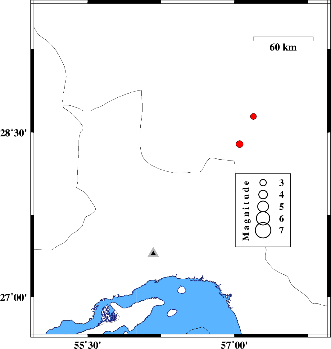 2011/03/14 07:55:09.8 11:25:09.8 27.756.7925 ML4.8 Hormozgan Province, 54 km North-West of Dehbarez