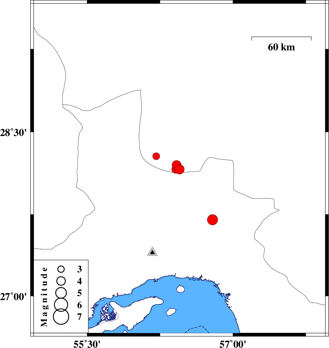2011/03/14 07:55:09.8 11:25:09.8 27.756.7925 ML4.8 Hormozgan Province, 54 km North-West of Dehbarez