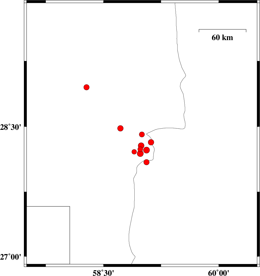 | 2011/02/18 | 08:56:33.0 | 12:26:33.0 | 28.23 | 59.06 | 18 | ML3.7 | Kerman Province, 119 km South-East of Bam |