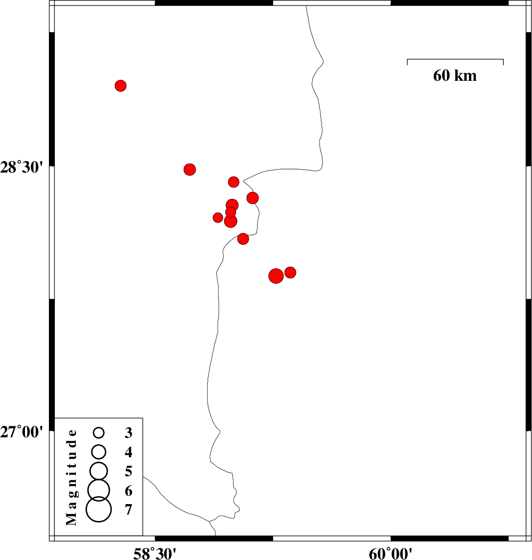 | 2011/02/19 | 01:07:27.5 | 04:37:27.5 | 28.28 | 58.99 | 14 | ML3.5 | Kerman Province, 111 km South-East of Bam |