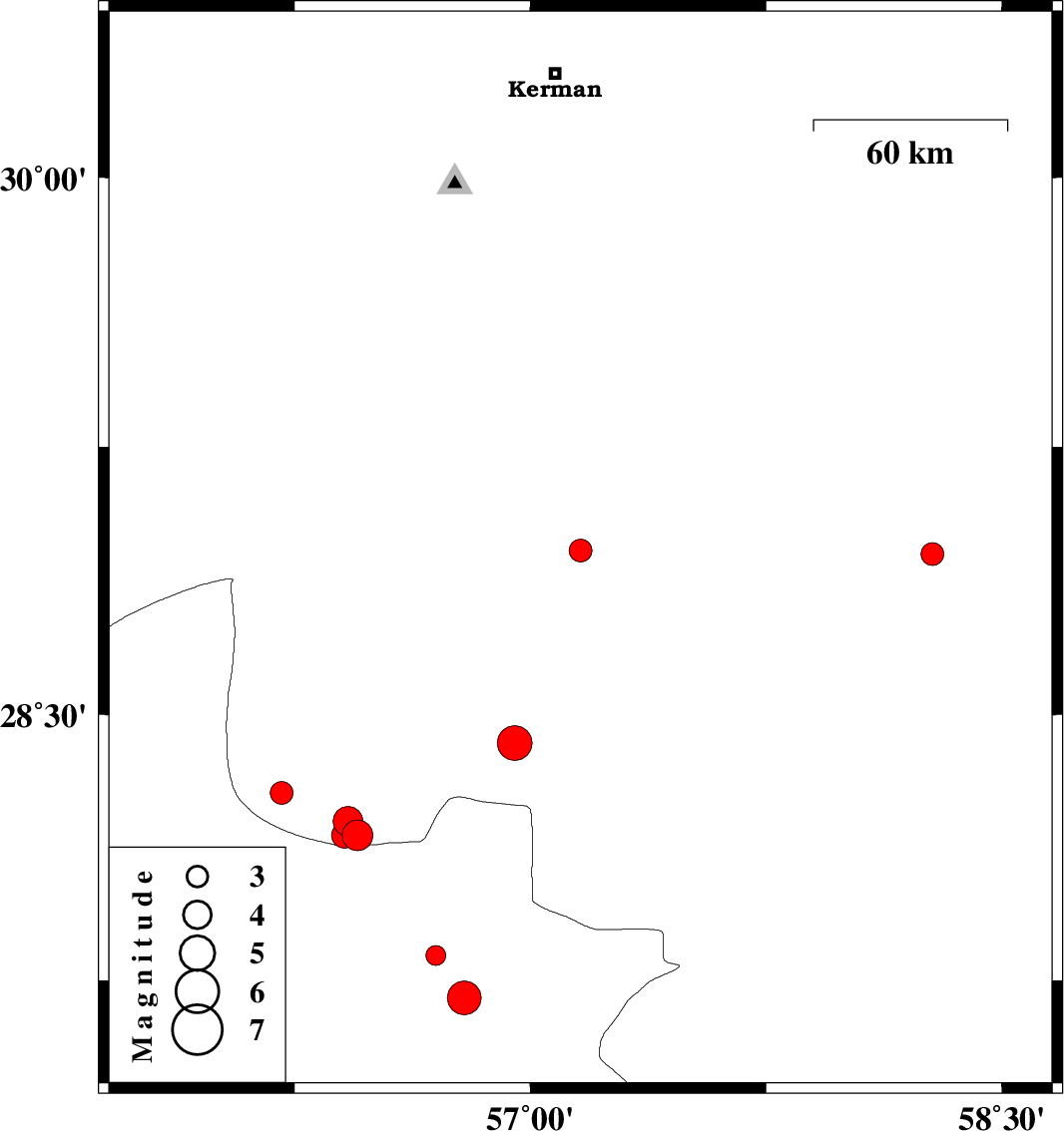 | 2011/03/02 | 00:40:08.7 | 04:10:08.7 | 28.95 | 58.28 | 14 | ML3.3 | Kerman Province, 19 km South of Bam | ||