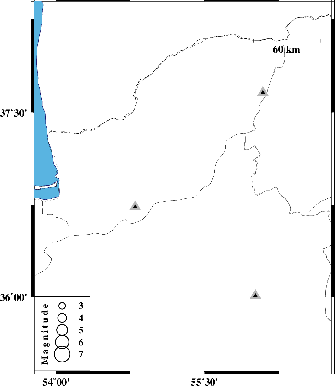 | 2011/03/22 | 03:46:56.3 | 08:16:56.3 | 36.89 | 55.28 | 14 | ML2.5 | Golestan Province, 18 km South-East of Ramian |