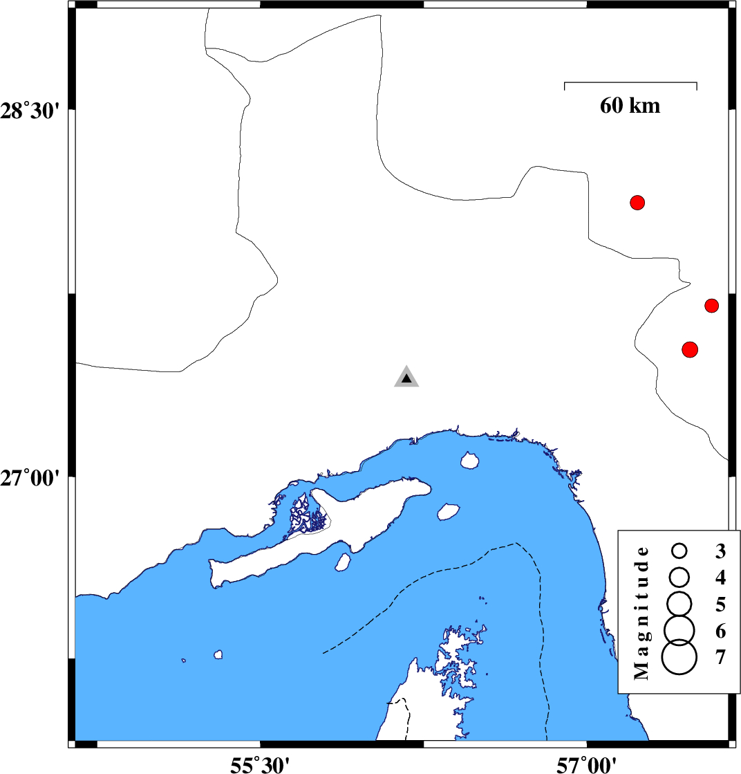| 2011/02/22 | 22:21:59.0 | 01:51:59.0 | 27.82 | 56.7 | 15 | ML2.8 | Hormozgan Province, 68 km North-West of Dehbarez |