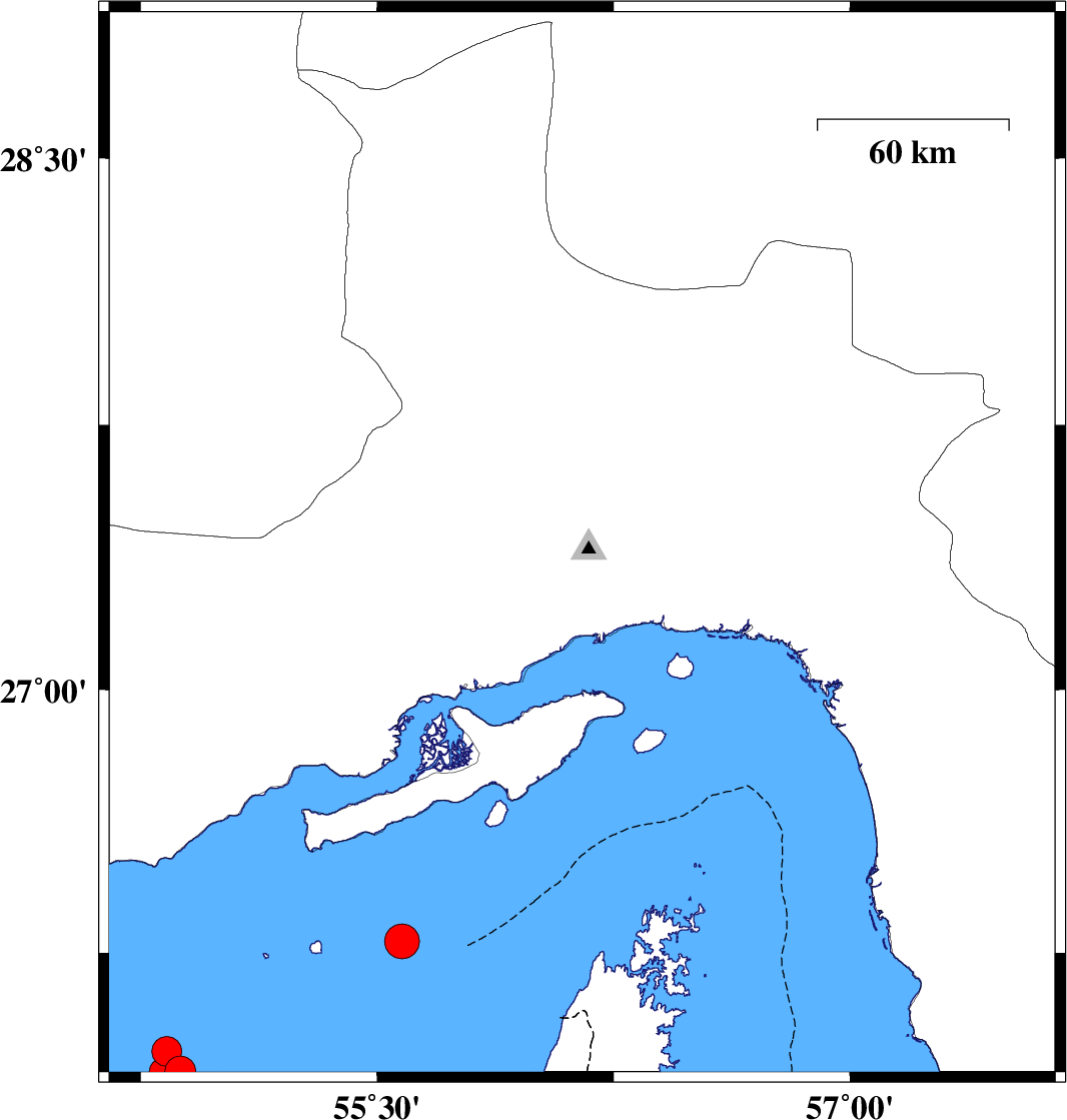 | 2011/03/06 | 00:25:24.2 | 03:55:24.2 | 27.33 | 54.98 | 15 | ML3.3 | Hormozgan Province, 62 km North-East of Bastak | ||