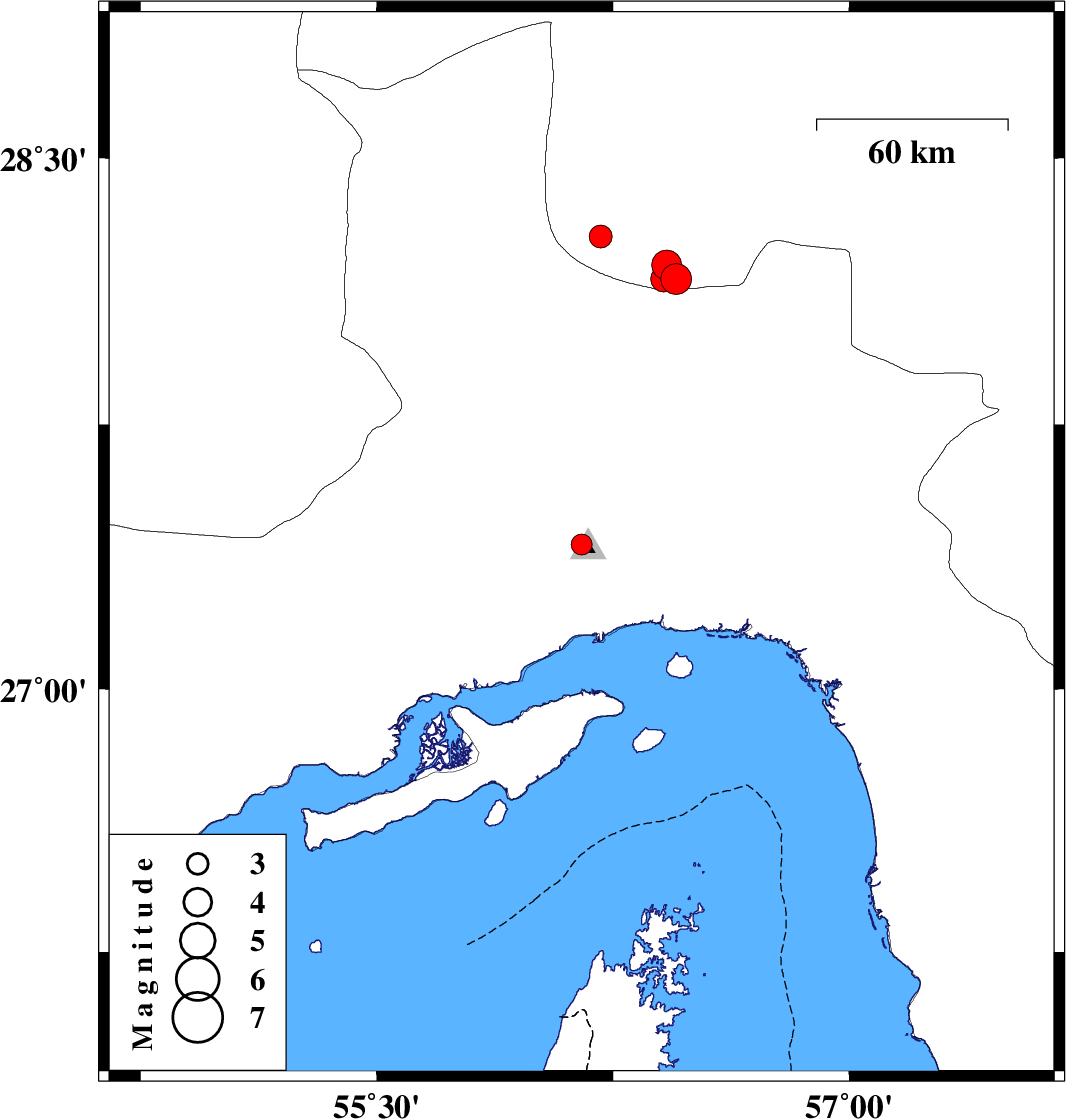 | 2011/03/18 | 02:17:47.1 | 05:47:47.1 | 28.16 | 56.41 | 38 | ML3.7 | Kerman Province, 53 km South-East of Hajiabad |