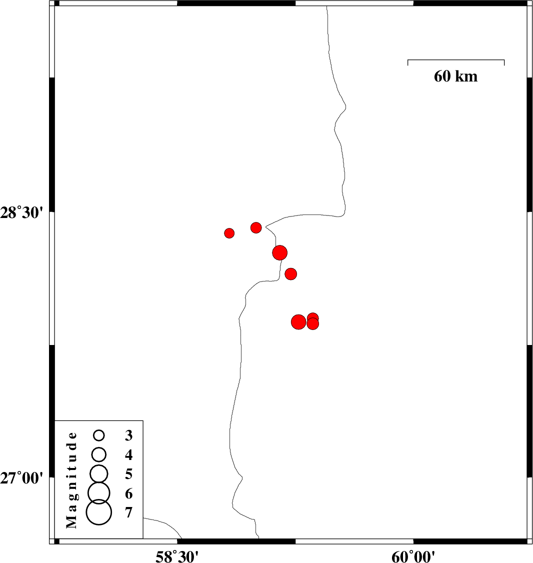 | 2011/03/19 | 23:24:09.5 | 02:54:09.5 | 28.41 | 59 | 15 | ML3.1 | Kerman Province, 100 km South-East of Bam |