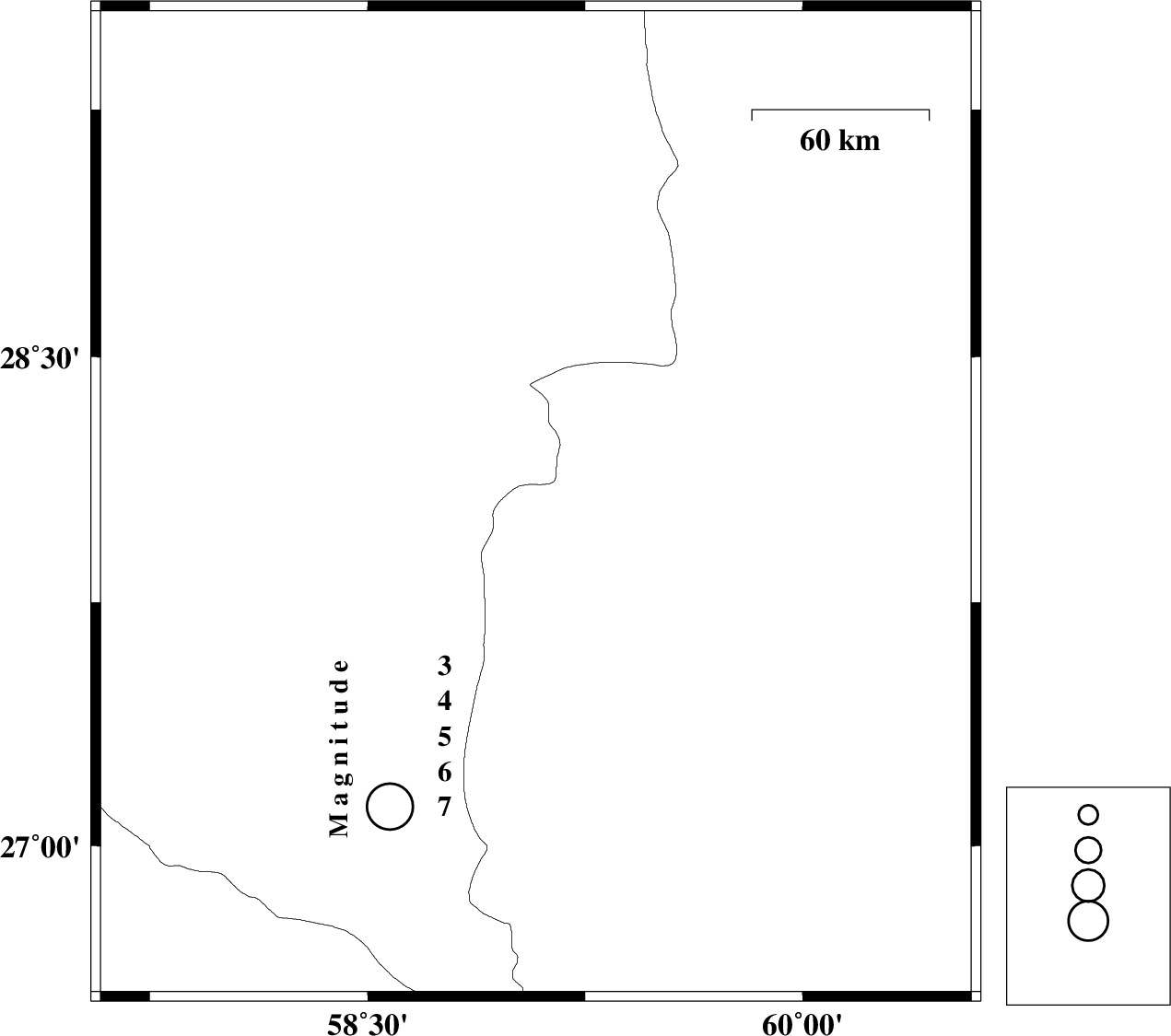 | 2011/03/21 | 06:02:22.5 | 09:32:22.5 | 27.88 | 59.27 | 18 | ML4.2 | Sistan va Baloochestan Province, 155 km East of Kahnuj | ||