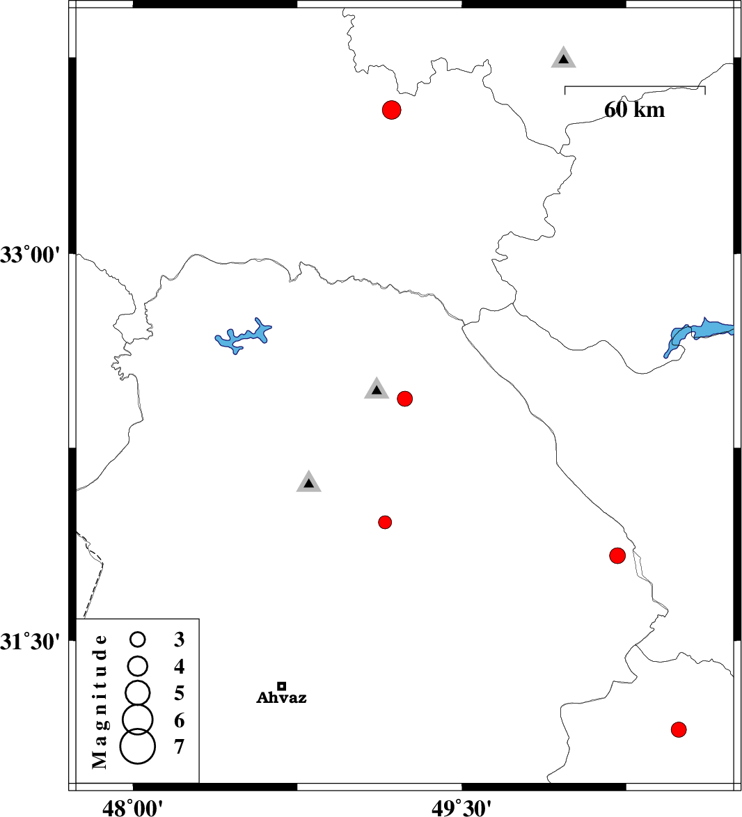 | 2011/03/26 | 19:59:55.3 | 00:29:55.3 | 31.96 | 49.15 | 14 | ML2.7 | Khoozestan Province, 14 km West of Masjed Soleyman | ||