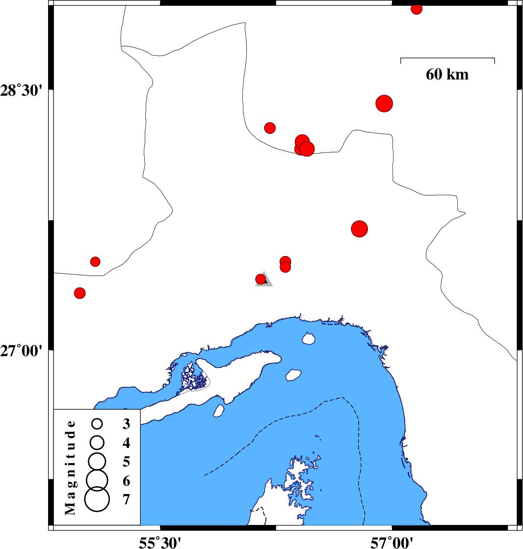 | 2011/03/06 | 00:25:24.2 | 03:55:24.2 | 27.33 | 54.98 | 15 | ML3.3 | Hormozgan Province, 62 km North-East of Bastak | ||