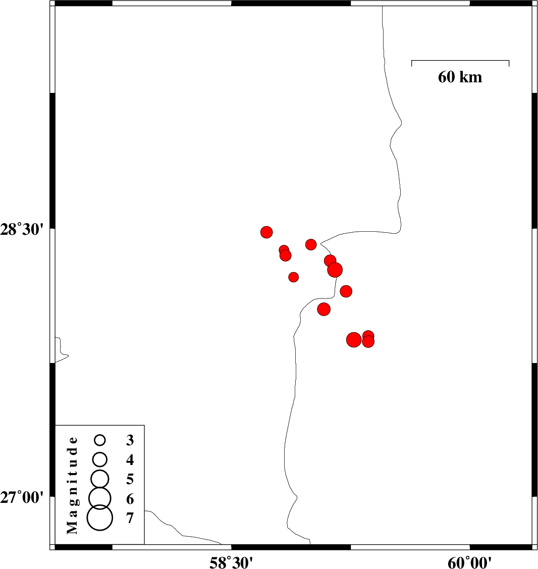 | 2011/04/04 | 19:34:51.4 | 00:04:51.4 | 28.23 | 58.89 | 14 | ML2.8 | Kerman Province, 111 km South-East of Bam | ||