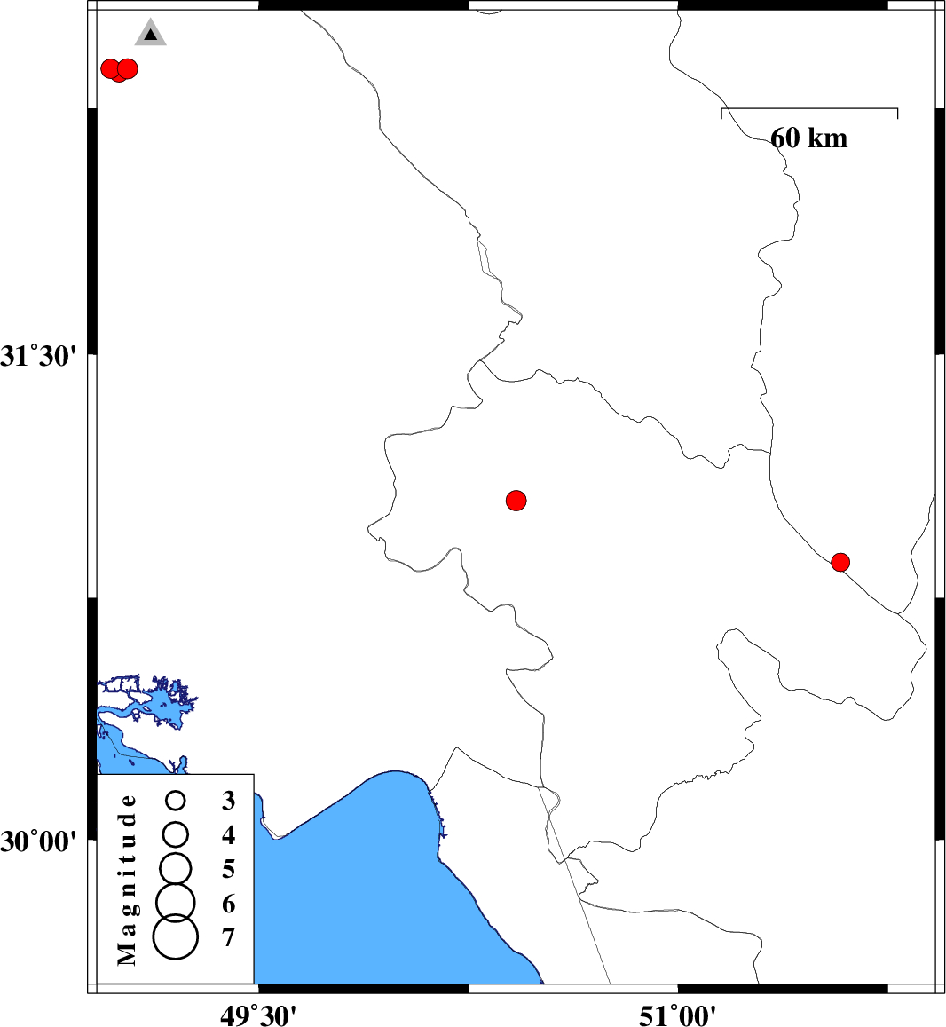 | 2011/04/05 | 06:33:27.7 | 11:03:27.7 | 32.37 | 48.97 | 16 | ML3.1 | Khoozestan Province, 13 km West of Lali | ||