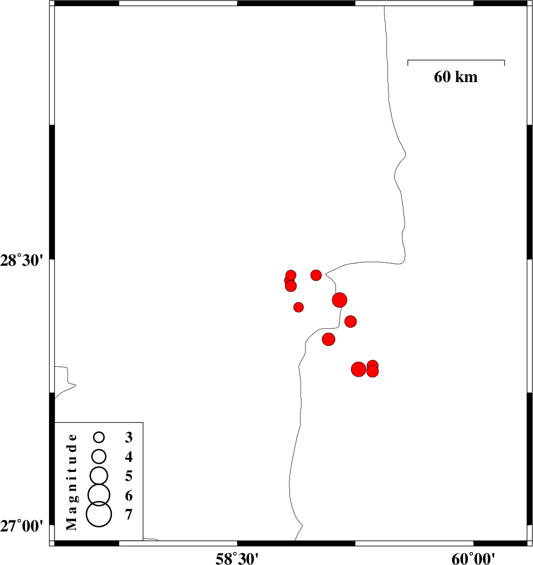 | 2011/04/04 | 19:34:51.4 | 00:04:51.4 | 28.23 | 58.89 | 14 | ML2.8 | Kerman Province, 111 km South-East of Bam | ||